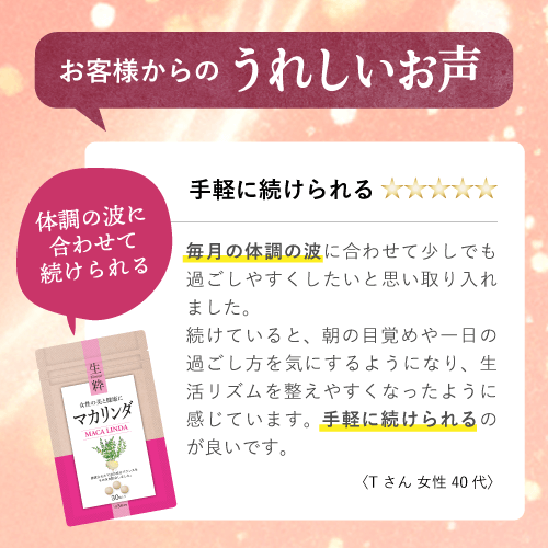 からだのリズムが崩れやすくなってきたことを感じて飲みはじめました。やる気ない倦怠感が軽減されてます。価格もお手頃で続けやすく気に入っています。