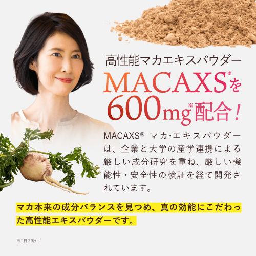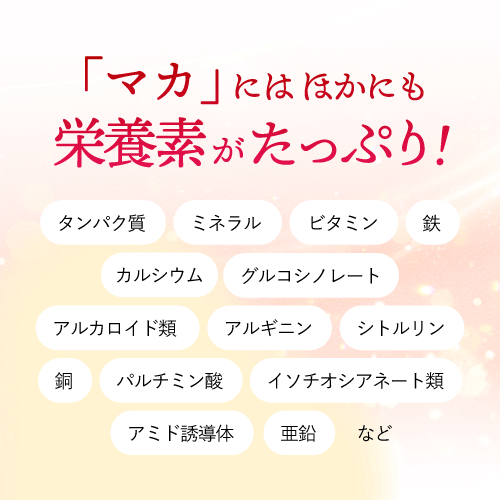 マカ抽出物(国内製造)、デキストリン/結晶セルロース、ショ糖脂肪酸エステル、二酸化ケイ素